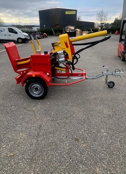 Scie circulaire à bois rouge et jaune avec deux roues et un attelage de remorque, conçu pour broyer les branches et les débris de jardin.